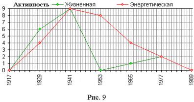 Еще через 12 лет в 1941 году уровень жизненной активности - 9. через 12 лет в 1936 году – ноль. Через 12 следующих лет в 1948 году – цифра 1, и в 1977-ом – цифра 2. Точки последовательно между собой соединяем получился график Жизненной активности (зеленым цветом).