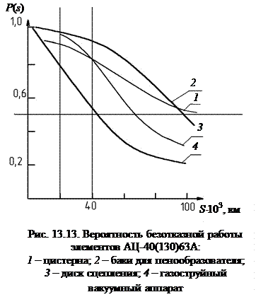 На практике возможна оценка вероятности безотказной работы и ремонтируемых изделий при условии, что они не восстанавливаются. Примеры оценки таких изделий показаны на рис. 13.13. На основании такой оценки возможно определять количество изделий, которые могут потребовать ремонта после определенного пробега, например, пожарного автомобиля.