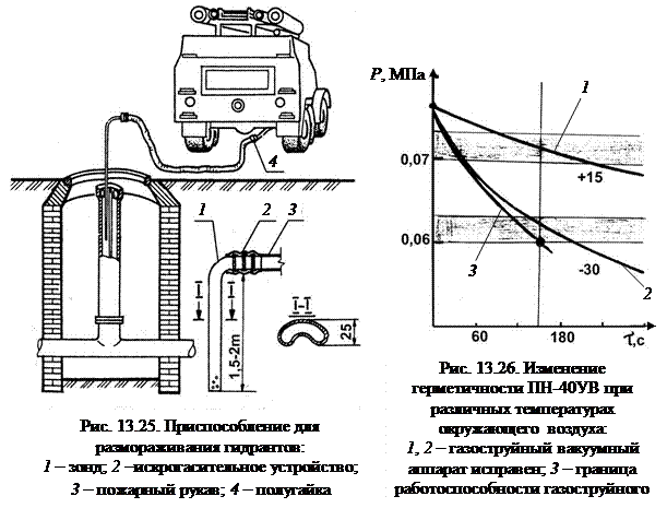 На рис. 13.25 показано устройство для размораживания гидрантов отработавшими газами. В нем имеется искрогасительное устройство 2, состоящее из трех латунных сеток с ячейками размером 2 – 3 мм.