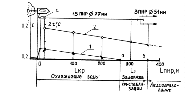 v = 1,5м/с и подаче воды 10,6 л/с. Рукавная линия была собрана так, как показано на рис. 13.28. В нее был вставлен подогреватель воды (А). Вода вблизи поверхности льда имела температуру около 0,2 ºС. В насосе в зависимости от развиваемого им напора и величины подачи воды она может нагреваться от 0,4 – 0,6 ºС. В дальнейшем, как показано прямой 1 на рис. 13.28, вода охлаждается, достигая 0 ºС на каком-то расстоянии от насоса. Интенсивность охлаждения увеличивается с понижением температуры окружающего воздуха и увеличением скорости ветра. В пределах точек а и б температура воды не изменяется. Ледообразование начнется после точки б. Лед будет образовываться на металлических деталях арматуры. При этом будут уменьшаться проходные сечения в стволах, разветвлениях (если они находятся в зоне ледообразования), что приводит к уменьшению подачи воды в 1,5 – 2 раза, через 1 – 2 ч работы насоса.