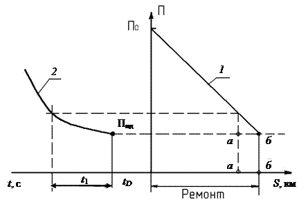 Герметичность у нового насоса обеспечивается тем, что на вал с некоторым предварительным натягом посажена резиновая манжета. Ее диаметр меньше диаметра вала. Вследствие износа деталей при эксплуатации через какую-то величину наработки насоса t пд диаметры сравняются. Это предельное состояние уплотнения. Начальному и предельному состоянию соответствуют начальный П0 и Ппд параметры его технического состояния. Изменение П во времени эксплуатации показано прямой 1 на рис. 13.30. Было установлено, что время падения создаваемого в насосе разрежения, измеряемое в секундах t с, в зависимости от диаметра вала насоса изменяется, как показано кривой 2 на рис. 13.30. Легко определить, что предельно допустимому параметру Ппд соответствует диагностический параметр tD. Таким образом, диагностическим параметром является время tD. Если при испытании насоса измеряемое падение вакуума t будет больше tD, то система будет работоспособной. На основании изложенного, можно прогнозировать срок надежной службы системы. Пусть измеренное время падения вакуума будет t 1, тогда, как показано на рисунке, возможная продолжительность работоспособного состояния системы будет определяться отрезком аб.