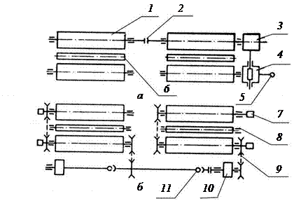 1 – ролик; 2 – маховик; 3 – цепная передача; 4 – соединительные электромагнитные муфты; 5 – редуктор; 6 – передаточный вал; 7 – электродвигатель