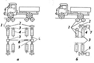 а – с приводом от ведущих колес автомобиля; б – с приводом от электродвигателя;