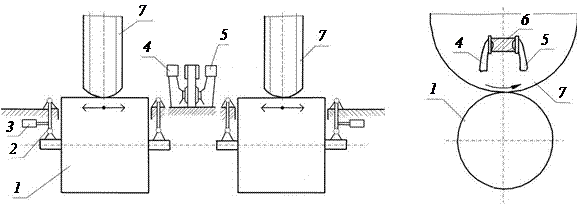1 – беговой барабан; 2 – маятниковая подвеска (серьга); 3 – индуктивный датчик боковой силы перемещения барабана; 4, 5 – передний и задний захваты;