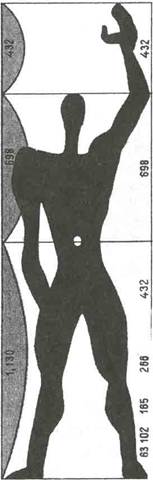 В основу модулора были положены конкретные пропорции человеческого тела — высота человека одного роста — одной модели. Причем, Ле Корбюзье пришлось отрабатывать несколько вариантов человека-образца. И поскольку это был образец, величину его роста и определили как средний или выше среднего. Ле Корбюзье пишет [12]: «... в первом варианте модулора он был ростом 175 см, а в положении с поднятой рукой имел размер 216 см. От этих исходных данных и были подсчитаны остальные» (рис. 8).