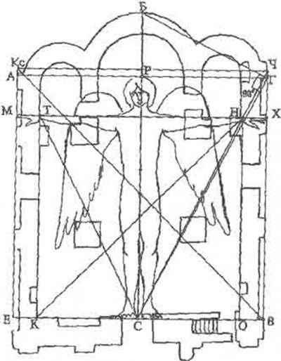 Рис. 14. План церкви Успения в Старой Ладоге. Мерный ангел живого квадрата на плане церкви Успения [18]предлагаемого плана.