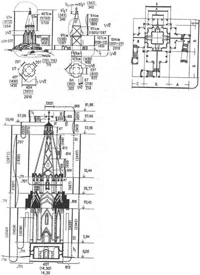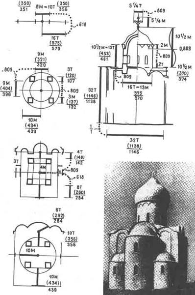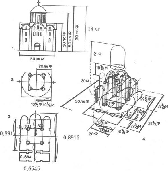 Рассмотрим пропорционирование элементов зданий, выполняемых на основе «Всемера» А.А.Пилецкого, на примере Великой Печерской церкви в Киеве (рис.17). Чертежи и размеры церкви взяты из работы [20] и выполнены И.Ш.Шевелевым на основе предложенной им методики «парной меры» геометрического сопряжения мер —саженей, по которой пропорции объектов в древности замерялись только двумя — тремя измерительными инструментами, сопряженными между собой в отношении 2: 5 или 1: (5 - 1).