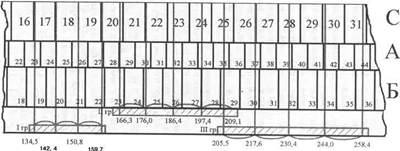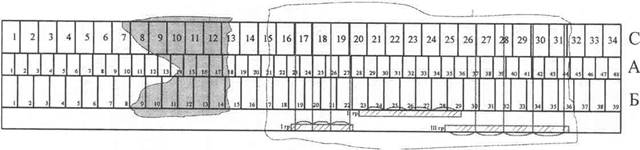 Поскольку клетка выступает как квант, а на нее проектируется отметка длины сажени, то не имеет значения, в каком месте клетки окажется зарубка сажени. И потому отметки саженей можно наносить по их истинной длине, зарубки эти располагать на пустошовке в соответствии с правилом групп и строк «Всемера» (рис. 21).