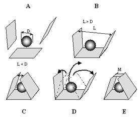 И группа свободных элементов (А), и группа взаимодействующих элементов (В), при условии L>D, имеют одинаковый результат действия - толкают шар, но не лишают его свободы движения. При случайном уменьшении размера выхода полости по отношению к диаметру шара (С) возникнет ловушка для шара, но при его движении плоскости вновь могут разойтись и шар не лишается свободы движения (D). При постоянной фиксации выхода полости (перемычка M, на рис. D) шар вообще лишается свободы движения. При этом группа элементов из трёх плоскостей становится ловушкой для шара, т.е., у этой группы появляется цель – лишить шар свободы движения.
