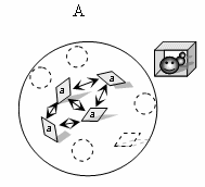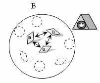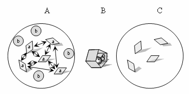 В некой группе есть два типа элементов – «a» и «b» (А). Цель системы – быть ловушкой для червячка (В). Цели системы соответствуют только элементы типа «а», потому что только они могут сложится в пятиугольную полость и быть ловушкой. Элементы типа «b» не содействуют заданной цели и не являются элементами данной системы. Стрелками указаны взаимодействия между элементами, которые приводят к достижению цели.