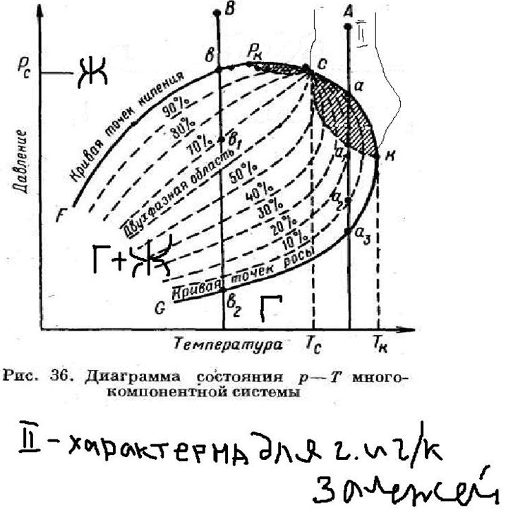 Pk - точка кригондебары; К- точка крикондетермы Кривая GC определяет состояние начала конденсации многокомпонентной системы. Кривая FC определяет состояние начала испарения (конца конденсации) многокомпонентной системы. Пересечение кривых GC и FC определяет критическую точку многокомпонентной системы. Точке С соответствуют критические температура Тс и давление рс. Область, ограниченная кривыми точек росы и точек кипения, определяет условия двухфазного состояния многокомпонентной системы. Пунктирные линии внутри этой области соответствуют процентному содержанию (по массе) смеси в жидком состоянии.