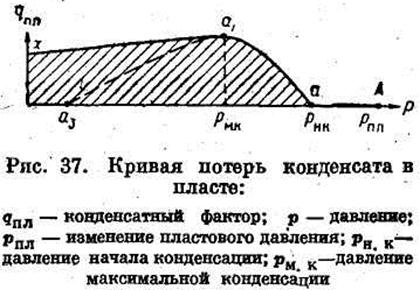 Разработка месторождений ведется практически в изотермических условиях отбора газа из пласта. При разработке газоконденсатной залежи, характеризуемой точкой А, при снижении пластового давления до точки а в залежи начнется конденсация углеводородов, количество выпадающего в пласте конденсата будет возрастать с понижением давления от а до точки а1 (см. рис. 36). Выпадающий конденсат будет накапливаться в порах пласта и огромное количество его может быть безвозвратно потеряно. На рис. 37 кривая аа1а3 характеризует потери конденсата в пласте. Теоретически потери конденсата в пласте соответствуют кривой аа1а3, практически же потери соответствуют кривой аа1Х, так как на испарение выпавшего в пористой среде конденсата требуется значительно большее время, чем время разработки месторождения. Это можно объяснить тем фактом, что конденсация происходит практически мгновенно, а процесс испарения идет крайне медленно из-за влияния сорбционных сил, сил поверхностного натяжения и большой теплоты испарения.