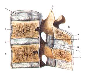 Рисунок 47. Соединения позвонков.Сагиттальный распил на уровне двух поясничных позвонков. 1 - тело позвонка; 2 - студенистое ядро межпозвоночного диска; 3 - передняя про-дольная связка; 4 - фиброзное кольцо межпозвоночного диска; 5 - верхний суставной отрос-ток поясничного позвонка; 6 - задняя продольная связка; 7 - межпозвоночное отверстие; 8 -желтая связка; 9 - суставная капсула дугоотростчатого (межпозвоночного) сустава; 10 -межостистая связка; 11 - надостистая связка.