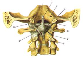 1. Покровная мембрана, membrana tectoria, которая представляет собой широкую, довольно плотную, волокнистую пластинку, натянутую от переднего края большого затылочного отверстия к телу осевого позвонка. Эта перепонка называется покровной, потому что она покрывает сзади (со стороны позвоночного канала) зуб, поперечную связку атланта и другие образования этого сустава. Ее рассматривают как часть задней продольной связки позвоноч-ного столба.