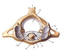 Рисунок 49. Срединный атланто-осевой сустав (articulatio atlantoaxialis mediana). Вид сверху. 1 - задний бугорок атланта; 2 - позвоночное отверстие; 3 - верхняя суставная ямка (атланта); 4 - отверстие поперечного отростка атланта; 5 - поперечная связка атланта; 6 -срединный атланто-осевой сустав (задняя часть); 7 - зуб осевого позвонка; 8 - срединный ат-ланто-осевой сустав (передняя часть); 9 - передний бугорок атланта; 10 - крыловидная связка.