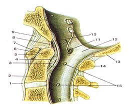 Рисунок 50. Срединный атланто-осевой сустав (articulatio allantoaxialis mediana). Сагит-тальный разрез. 1 - передняя продольная связка; 2 - тело осевого позвонка; 3 - поперечная связка атланта; 4 - атланто-осевой сустав (задняя часть); 5 - атланто-осевой сустав (передняя часть); 6 - зуб осевого позвонка; 7 - передняя дуга атланта; 8 - связка верхушки зу-ба; 9 - передняя атланто-затылочная мембрана; 10 - покровная мембрана; 11 - позвоночная артерия; 12 - твердая мозговая оболочка; 13 - затылочная кость(чешуя); 14 - задняя дуга атланта; 15 - I и II спинномозговые нервы.
