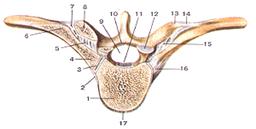 Рисунок 51. Реберно-позвоночные суставы (articulationescostovertebralis). Поперечный разрез через позвоночный столб на уровне VI грудного позвонка. 1 -тело VI грудного позвонка; 2 -лучистая связка головки ребра; 3 - сустав головки ребра; 4 - головка ребра; 5 - медиальная реберно-иомеречная связка; 6 - бугорок ребра; 7 - реберно-поперечный сустав; 8 - поперечный отросток VII грудного позвонка; 9 - позвоночное отверстие; 10 - желтая связка; 11 - задняя продольная связка; 12 - верхний суставной отросток VI грудного позвонка; 13 - реберно-поперечный сустав; 14 - реберно-поперечная связка; 15 - медиальная реберно-поперечная связка; 16 - лучистая связка головки ребра; 17 - передняя продольная связка.