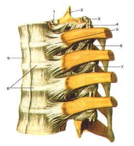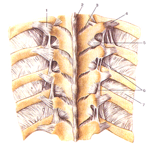 Рисунок 53. Связки позвоночника и реберно-позвоночных суставов. 1 - связка бугорка ребра; 2 - надостистая связка; 3 - желтая связка; 4 - реберно-поперечная связка; 5 -латеральная реберно-поперечная связка; 6 - межпоперечные связки; 7 - внутренняя межребе-рная мембрана.