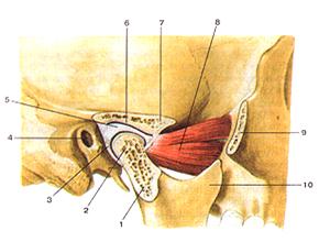 Рисунок 54. Височно-нижнечелюстной сустав (articulalio temporomandlibularis). Сагиттальный разрез. 1 - суставной (мышелковый) отросток нижней челюсти; 2 - головка нижней челюсти; 3 - суставиая капсула; 4 - наружный слуховой проход; 5 - суставной (внутрисуставной) диск; 6 - нижнечелюстная ямка; 7 - суставной бугорок; 8 - латеральная крыловидная мышца; 9 - височный отросток скуловой кости (отрезан); 10 - венечный отросток нижней челюсти.