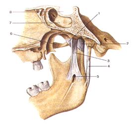 1) Клиновидно-нижнечелюстная связка, lig. sphenomandihulare, начинается от spina ossis sphenoidalis и прикрепляется к lingula mandibulae.