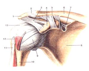 Рисунок 57. Акромиально-ключичный сустав (articulatio acromio-clavicularis) и плечевой сустав (articulatio humeri). Вид спереди. 1 - акромион; 2 - акромиалыю-ключичный сустав (акромиально-ключичная связка); 3 - клювовидно-акромиальная связка; 4 - клювовидный отрос-ток; 5 - клювовидно-ключичная связка; 6 - ключица; 7 - верхняя поперечная связка лопатки; 8 -лопатка; 9 - капсула плечевого сустава; 10 - плечевая кость; 11 - сухожилие длинной головки двуглавой мышцы плеча; 12 - подлопаточная мышца; 13 - клювовидно-плечевая связка.