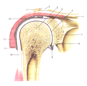 Рисунок 58. Плечевой сустав (articulatio huineri). Фронтальный разрез. 1 - акромион; 2 -акромиально-ключичный сустав; 3 - голова плечевой кости; 4 - суставная щель плечевого сус-тава; 5 - суставная впадина лопатки; 6 - ключица; 7 - лопатка; 8 - суставная губа; 9 - подмы-шечный карман суставной полости; 10 - сухожилие длинной головки двуглавой мышцы плеча; 11 - синовиальное влагалище сухожилия длинной головки двуглавой мышцы плеча; 12 - дельто-видная мышца. 13 - поддельтовидная сумка.