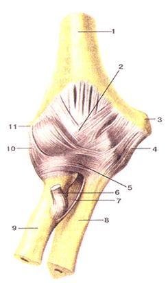 Рисунок 59. Локтевой сустав (articulatiocubiti). Вид спереди. 1 - плечевая кость; 2 - сустав-ная капсула; 3 - медиальный надмыщелок плечевой кости; 4 - локтевая коллатератьная связка; 5 - кольцевая связка лучевой кости; 6 - сухожилие двуглавой мышцы плеча; 7 - косая хорда; 8 -локтевая кость; 9 - лучевая кость; 10 - лучевая коллатеральная связка; 11 - латеральный надмышелок.