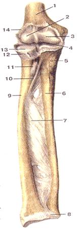 сустава вскрыта). I - плечевая кость; 2 - головка мыщелка плечевой кости; 3 - блок плечевой кости; 4 - полость локтевого сустава; 5 - бугристость локтевой кости; 6 - тело локтевой кости; 7 - межкостная мембрана; 8 - дистальный луче-локтевой сустав; 9 - тело лучевой кости; 10 - косая хорда; 11 - сухожилие двуглавой мышцы плеча (отрезано); 12 - кольцевая связка лучевой кости; 13 - головка лучевой кости; 14 - капсула локтевого сустава.