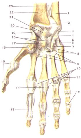 Рисунок 61. Луче-запястный сустав (articulartio radiocarpea); связки и суставы кисти, правой. Ладонная сторона. 1 - локтевая кость; 2 - дистальный луче-локтевой сустав; 3 - лок-тевая коллатеральная связка запястья; 4 - гороховидная кость; 5 - гороховидно-крючковая связка; 6 - гороховидно-пястная связка; 7 - крючок крючковидной кости; 8 - ладонные запяст-но-пястные связки; 9 - ладонные пястные связки; 10 - глубокие поперечные пястные связки; 11 - пястно-фаланговый сустав V пальца (вскрыт); 12 - межфаланговые суставы V пальца; 13 -сухожилие мышцы — глубокого сгибателя пальцев; 14 - фиброзное влагалище сгибателей III пальца кисти; 15 - коллатеральные связки пястно-фалангового и межфалангового суставов I пальца кисти; 16 - запястно-пястный сустав I пальца кисти; 17 - головчатая кость; 18 -лучевая связка запястья; 19 - лучевая коллатеральная связка; 20 - ладонная луче-запястная связка; 21 - полулунная кость; 22 - лучевая кость; 23 - межкостпая перепонка предплечья.