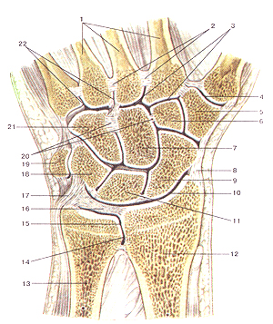 связки кисти, правой. Разрез во фронтальной плоскости. I - пястные кости; 2 - межкостные межпястные связки; 3 - запястно-пястныс суставы; 4 - запястно-пястный сустав I пальца кисти; 5 - многоугольная кость; 6 - трапециевидная кость; 7 - головчатая кость; 8 - лучевая коллатеральная связка запястья; 9 - ладьевидная кость; 10 - луче-запястный сустав; 11 -полулунная кость; 12 - лучевая кость; 13 - локтевая кость; 14 - мешкообразное углубление дис-тального луче-локтевого сустава; 15 - дистальный луче-локтевой сустав; 16 - внутри-суставной диск луче-запястного сустава; 17 - локтевая коллатеральная связка запястья; 18 -трехгранная кость; 19 - гороховидная кость; 20 - межкостные межзапястные связки; 21 -крючковидная кость; 22 - межпястные суставы.