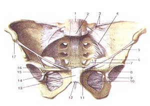 Тазовая кость, кроме крестцово-подвздошного сустава, соединяется с позвоночным столбом посредством ряда мощных связок, к которым относятся следующие: