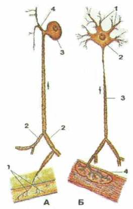 Рисунок 294. Нервные клетки. А — чувствительный нейрон. Б — двигательный нейрон. Стрелки показывают направление следования нервных импульсов. А: 1 - чувствительные нервные окончания; 2 - дендриты; 3 - тело нервной клетки; 4 - аксон. Б: 1 - дендриты; 1 - тело нервной клетки; 3 - аксон; 4 - двигательное нервное окончание (нервно-мышечная бляшка).