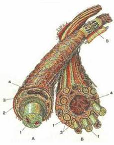 Рисунок 295. Нервные волокна. А — миелиновое волокно. Б — безмиелиновое волокно.