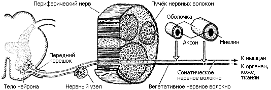 Периферическая нервная система представлена аксонами нервных клеток (осевыми цилиндрами), которые либо покрыты неврилеммой шванновских клеток (безмякотные волокна), либо между неврилеммой и осевым цилиндром имеется многослойная миэлиновая оболочка (мякотные волокна). Мякотные и безмякотные волокна объединяются в пучки, ограниченные трубчатой соединительно-тканной оболочкой — периневрием. Внутри периневральной трубки каждое нервное волокно окружает рыхлая соединительная ткань (эндоневрий). Пучки волокон, покрытые оболочкой, называют нервами. Часто пучки переходят в более толстые образования — нервные стволы, в которых несколько пучков окружены рыхлой соединительной тканью — эпиневрием.