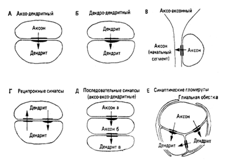 Ширина синаптической щели в химических синапсах — 20-30 нм, а в электрических — 2-4 нм. Синапсы классифицируют по их расположению на поверхности постсинаптического нейрона. Если аксон оканчивается на дендрите другого нейрона, это аксо-дендритный синапс (рис. 297.1.) (часто синаптическая бляшка как бы «надевается» на специальные выступы — дендритные шипики), если же на соме другого нейрона, это аксо-соматический синапс (около половины поверхности сомы и почти вся поверхность дендритов может быть усеяна контактами от других нейронов). Аксон образует иногда синапсы в своей проксимальной части, лишенной миэлина, либо на синаптической бляшке другого нейрона. Такие синапсы являются аксо-аксонными (В, Д). Реже встречаются синапсы между дендритами (дендро-дендритные) (Б) и между дендритными шипиками и телом другого нейрона (дендро-сома-тические). В окончаниях периферических нервов на мышцах имеются нервно-мышечные (мионевральные) синапсы, на железах — нейросекреторные, а на внутренних органах — органные синапсы. Аксо-васкулярные синапсы наблюдают между нейросекреторными клетками гипоталамуса и стенками капилляров.