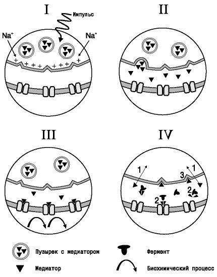 Работа этих медиаторов показана на рисунке 298. Условно (так как он занимает считанные доли секунды) весь процесс передачи информации можно разбить на четыре этапа. Как только по пресинаптическому окончанию поступает импульс, на внутренней стороне клеточной мембраны за счет входа ионов натрия происходит образование положительного заряда, и пузырьки с медиатором начинают приближаться к пресинаптической мембране (этап I). На втором этапе осуществляется выход медиатора в синаптическую щель из пузырьков в месте их контакта с пресинаптической мембраной. После выделения из нервных окончаний нейромедиатор проходит синаптическую щель путем диффузии и связывается со своими рецепторами постсинаптической мембраны клетки исполнительного органа или другой нервной клетки (этап III). Активация рецепторов запускает в клетке биохимические процессы, приводящие к изменению ее функционального состояния в соответствии с тем, какой сигнал был получен от афферентных звеньев. На уровне органов это проявляется сокращением или расслаблением гладких мышц (сужением или расширением сосудов, учащением или замедлением и усилением или ослаблением сокращений сердца), выделением секрета и так далее. И, наконец, на четвертом этапе происходит возвращение синапса в состояние покоя либо за счет разрушения медиатора ферментами в синаптической щели, либо благодаря транспорту его обратно в пресинаптическое окончание. Сигналом к прекращению выделения медиатора служит возбуждение им рецепторов пресинаптической мембраны.