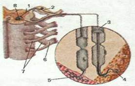 Рисунок 299. Простейшая двухнейронная рефлекторная дуга. 1 - чувствительный нейрон; 2 - спинномозговой узел; 3 - миелиновое нервное волокно; 4 - чувствительное нервное окончание; 5 - нервное окончание (бляшка) на мышечном волокне; 6 - спинномозговой нерв; 7 - корешки спинномозговых нервов; 8 - эфферентный (двигательный) нейрон в переднем роге спинного мозга.