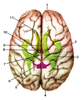 Рисунок 300. Большой мозг (cerebrum). Проекция боковых желудочков на поверхность полу-шарий большого мозга. Вид сверху. I - лобная доля; 2 - центральная борозда; З - боковой желудочек; 4 - затылочная доля; 5 - задний рог бокового желудочка; 6 - IV желудочек; 7 -водопровод мозга; 8 - III желудочек; 9 - центральная часть бокового желудочка; 10 - нижний рог бокового желудочка; 11 - передний рог бокового желудочка.