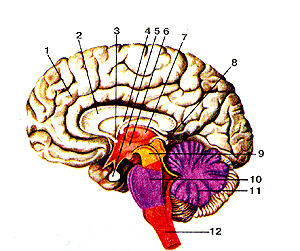 I - полушарие большого мозга; 2 - мозолистое тело; 3 - передняя (белая) спайка; 4 - свод мозга; 5 - гипофиз; 6 - полость промежуточного мозга (III желудочек); 7 - таламус; 8 - эпифиз мозга; 9 - средний мозг; 10 - мост; 11 - мозжечок; 12 - продолговатый мозг.