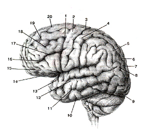 Рисунок 302. Верхне-латеральная поверхность полушария большого мозга. I - пред-центральная борозда; 2 - предцентральная извилина; 3 - центральная борозда; 4 - постц-ентральная извилина; 5 - верхняя теменная долька; 6 - внутритеменная борозда; 7 - нижняя теменная долька; 8 - угловая извилина; 9 - затылочной полюс; 10 - нижняя височная извилина; 11 - нижняя височная борозда; 12 - средняя височная извилина; 13 - верхняя височная извилина; 14 - латеральная борозда; 15 - глазничная часть; 16 - нижняя лобная извилина; 17 - нижняя лобная борозда; 18 - средняя лобная извилина; 19 - верхняя лобная борозда; 20 - верхняя лобная извилина.