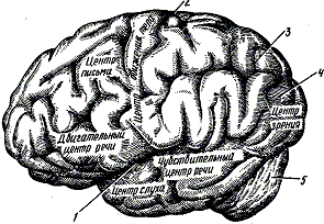 Рисунок 303. Передний мозг. 1 - сильвиева борозда; 2 - центральная борозда; З - теменно-затылочная борозда; 4 - затылочная доля; 5 - мозжечок.
