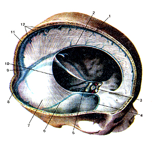 Рисунок 305. Твердая оболочка головного мозга (dura mater encephali). Синусы твердой оболочки. 1 - серп большого мозга; 2 - нижний сагиттальный синус; 3 - передний межпешеристый синус; 4 - клиновидно-теменной синус; 5 - задний межпещеристый синус; 6 -верхний каменистый синус; 7 - намет мозжечка; 8 - поперечный синус; 9 - синусный сток; 10 -сигмовидный синус; 11 - верхний сагиттальный синус; 12 - устья верхних мозговых вен.