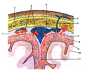 Рисунок 306. Оболочки головного мозга на поперечном (фронтальном) paзpeзе. Взаимо-расположение оболочек и верхнего сагиттального синуса со сводом черепа и поверхностью головного мозга. 1 - твердая оболочка головного мозга; 2 - свод черепа; 3 - грануляции паутинной оболочки; 4 - верхний сагиттальный синус; 5 - кожа; 6 - эмиссарная вена; 7 -паутинная оболочка головного мозга; 8 - подпаутинное пространство; 9 - мягкая оболочка головного мозга; 10 - головной мозг; 11 - серп большого мозга.