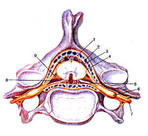 Рисунок 307. Оболочки спинного мозга (meninges medullae spinalis) в позвоночном канале. По-перечный разрез на уровне межпозвоночного диска. I - твёрдая оболочка спинного мозга; 2 -эпидуральное пространство; 3 - паутинная оболочка; 4 - задний кореш