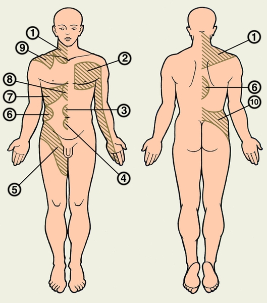 Рисунок 356. Схема расположения зон Захарьина-Геда на туловище и конечностях. В указанных зонах могут появляться боль и гиперестезия при заболеваниях легких и бронхов (1), сердца (2), кишечника (3), мочевого пузыря (4), мочеточников (5), почек (6), печени (7 и 9), желудка и поджелудочный желеэы (8), мочеполовой системы (10).