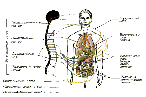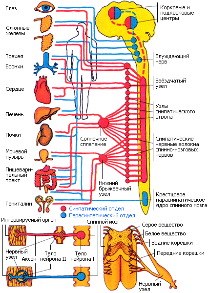 | Деятельность вегетативной нервной системы регулирует работу всех внутренних органов, приспосабливая их к потребностям всего организма | ||||||||