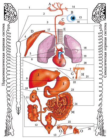 А — сосуды головного мозга; B — зрачок; C — слюнные железы; D — периферийные сосуды; E — бронхи; F — сердце; G — мышца, поднимающая волос; H — потоотделение; I — желудок; J — печень; K — почка; L — надпочечник; M — кишечник; N — мочевой пузырь; O — половые органы.