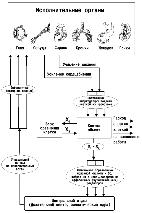 В момент, когда клетка стала сжигать больше этих веществ, чем приносит кровь при данной скорости кровотока, она сообщает вегетативной нервной системе о нарушении своего постоянного состава и отклонении от эталонного энергетического состояния. Центральные отделы вегетативной нервной системы при этом формируют управляющее воздействие, приводящее к комплексу изменений для восстановления энергетического голодания: учащению дыхания и сокращений сердца, ускорению распада белков, жиров и углеводов и так далее.
