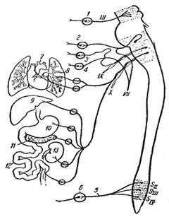 Парасимпатическая система. Это система состоит из волокон, начинающихся в головном мозгу и выходящих в составе III, VII, IХ и особенно Х (блуждающего) черепномозговых нервов и из волокон, начинающихся в крестцовом отделе спинного мозга и выходящих со спинномозговыми нервами этого отдела. Блуждающий нерв берет начало в продолговатом мозгу и спускается через область шеи в грудную и брюшную полости, где иннервирует сердце, дыхательную систему и пищеварительный тракт. Толстые кишки, мочевая система и половые органы иннервируются парасимпатическими волокнами через тазовые спинномозговые нервы. Радужная оболочка глаза, подъязычные и подчелюстные железы и околоушная железа иннервированы соответственно III, VII и IX парами черепномозговых нервов. Все эти нервы содержат аксоны первых нейронов в цепи; ганглии парасимпатической системы расположены в иннервируемых ими органах или около них, так что все аксоны вторичных нейронов сравнительно короткие.