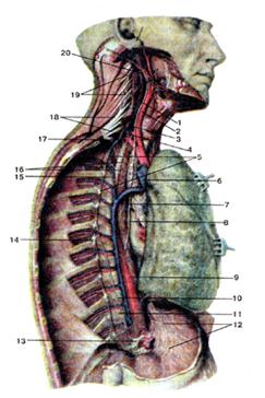 Рисунок 363. Симпатический ствол (truncus sympaticus) и его ветви. Вид справа. Пристеночный листок плевры и внутригрудная фасция удалены. Правое легкое оттянуто вперед. 1 - блуждающий нерв; 2 - общая сонная артерия; 3 - средний шейный (симпатический) узел; 4 - шейногрудной (звездчатый) узел (симпатический); 5 - симпатический ствол; 6 - верх-няя полая вена; 7 - непарная вена; 8 - правый блуждающий нерв; 9 - брюшная часть аорты; 10 - большой внутренностный нерв; 11 - малый внутренностный нерв; 12 - переднее желудоч-ное сплетение (вегетативное); 13 - чревное сплетение; 14 - соединительные ветви симпати-ческого ствола; 15 - пищеводные (симпатические) нервы; 16 - грудные сердечные (симпати-ческие) нервы; 17 - правая подключичная артерия (отрезана); 18 - плечевое сплетение; 19 -шейное сплетение; 20 - верхний шейный (симпатический) узел.